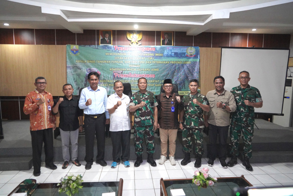 Jambi.WahanaNews.Co| Dalam upaya memperkuat ketahanan pangan Nasional, dilaksanakan penandatanganan Memorandum of Understanding (MoU) antara Kepala Dinas Tanaman Pangan, Hortikultura dan Peternakan (TPHP) Provinsi Jambi, Ir. Rumusdar, dengan Danrem 042/Gapu Brigjen TNI Heri Purwanto, S.E., M.Sc., pada Kamis (16/10/2025) pukul 10.30 WIB di Aula Kantor Dinas TPHP Provinsi Jambi, Jalan Lingkar Barat KM 12 Kota Baru, Jambi. Kegiatan tersebut juga dirangkai dengan penandatanganan kontrak konstruksi cetak sawah rakyat (CSR) antara Pejabat Pembuat Komitmen (PPK) Dinas TPHP Kabupaten Sarolangun dengan Dandim 0420/Sarko, Letkol Inf Yakhya Wisnu Arianto, S.Sos., M.Han.